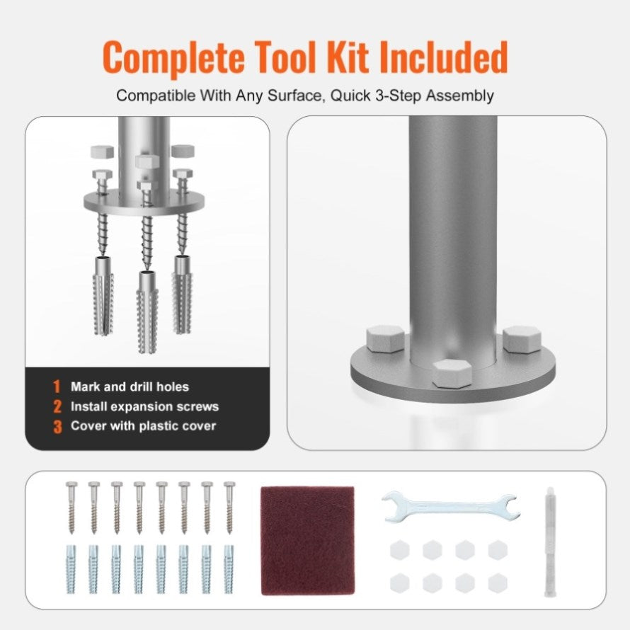 We provide a complete set of installation tools. Whether on concrete, wood, tile, or marble, you can set it up in just three steps. All necessary components, including an open-end wrench and drill bits, are included for effortless installation.