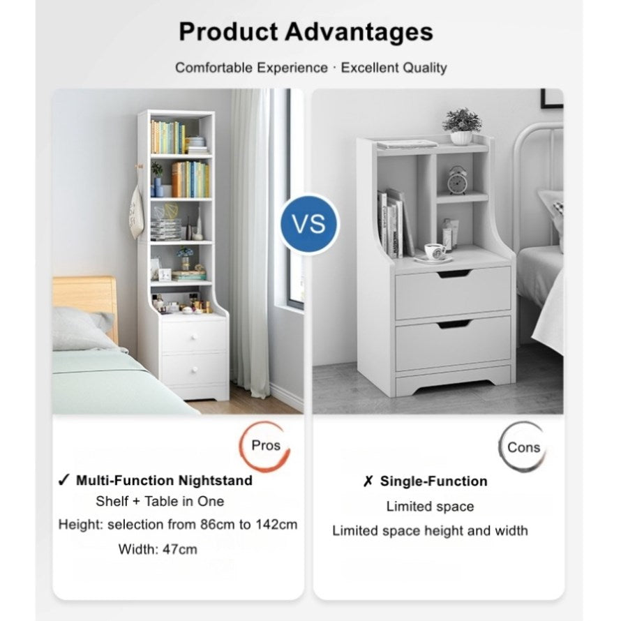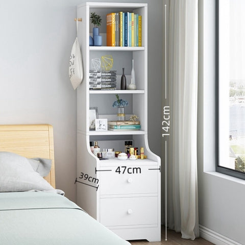 This modern minimalist bookcase bedside table features a pure warm white design, combining storage, display, and decorative functions. The upper section has four open storage shelves for placing books, decorative items, photo frames, and other objects, showcasing personal taste and style. The bottom section features two spacious drawers with matching round knobs, providing ample private storage space. The elegant curved side design adds a soft touch, and the top includes a hook for hanging bags, tapestries, or other items. This slim tall cabinet design doesn't take up much space, making it especially suitable for small bedrooms, serving as the perfect combination of bookshelf, display cabinet, and bedside table, both practical and decorative.