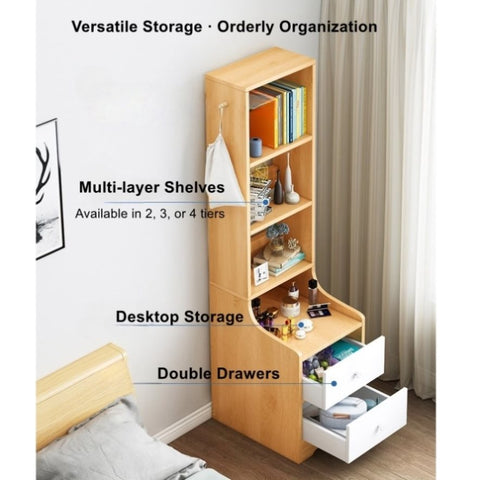 This modern minimalist bookcase bedside table features a pure warm white design, combining storage, display, and decorative functions. The upper section has four open storage shelves for placing books, decorative items, photo frames, and other objects, showcasing personal taste and style. The bottom section features two spacious drawers with matching round knobs, providing ample private storage space. The elegant curved side design adds a soft touch, and the top includes a hook for hanging bags, tapestries, or other items. This slim tall cabinet design doesn't take up much space, making it especially suitable for small bedrooms, serving as the perfect combination of bookshelf, display cabinet, and bedside table, both practical and decorative.