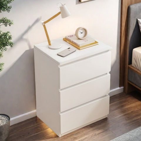 This modern minimalist bedside table features an ultra-simple design in warm white, presenting a clean and crisp visual effect. The cabinet has three spacious drawers, providing rich layered storage space to meet various storage needs. The flat top surface can be used for placing lamps, alarm clocks, phones, and other everyday items. This bedside table adopts a handle-free design, with recessed finger pulls on the front edges of the drawers, making them convenient to use while maintaining a sleek appearance. The pure geometric shape embodies minimalist design aesthetics, while the three-drawer layout provides more storage options, suitable for modern, Nordic, and minimalist bedroom decor.