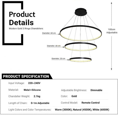3. Moderate Size: The size of high pendant lamp is moderate, and it will not occupy too much space. Round size: 60cm+40cm+20cm, base diameter 20cm, embedded 18cm, height 4cm, Gold pendant lamp, cable length adjustable 100cm meters.
