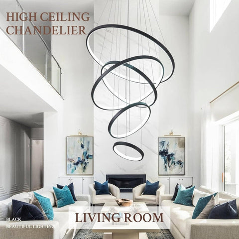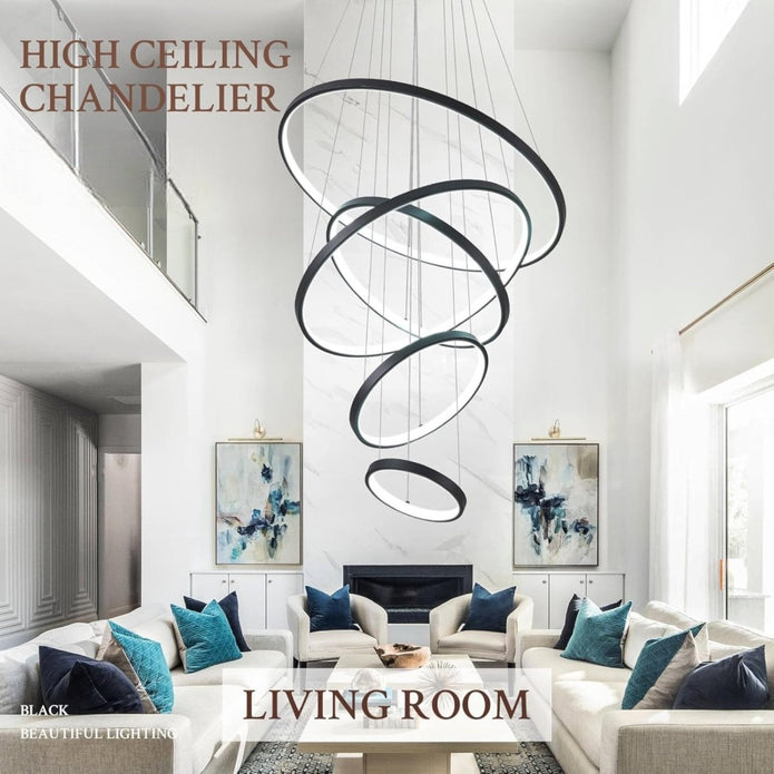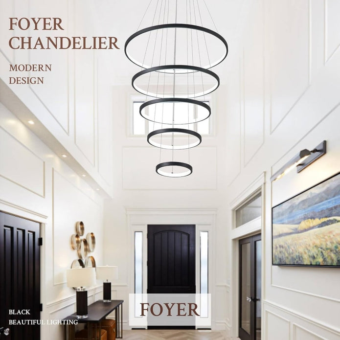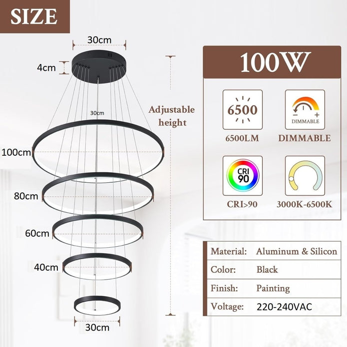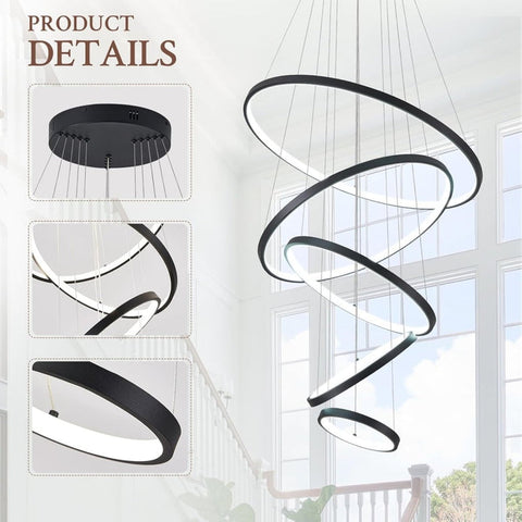 BAMDECOR A18801 Modern LED Chandelier, Dimmable Pendant Light with Remote Control Rings Round V255-BAM-18801/5-BLK