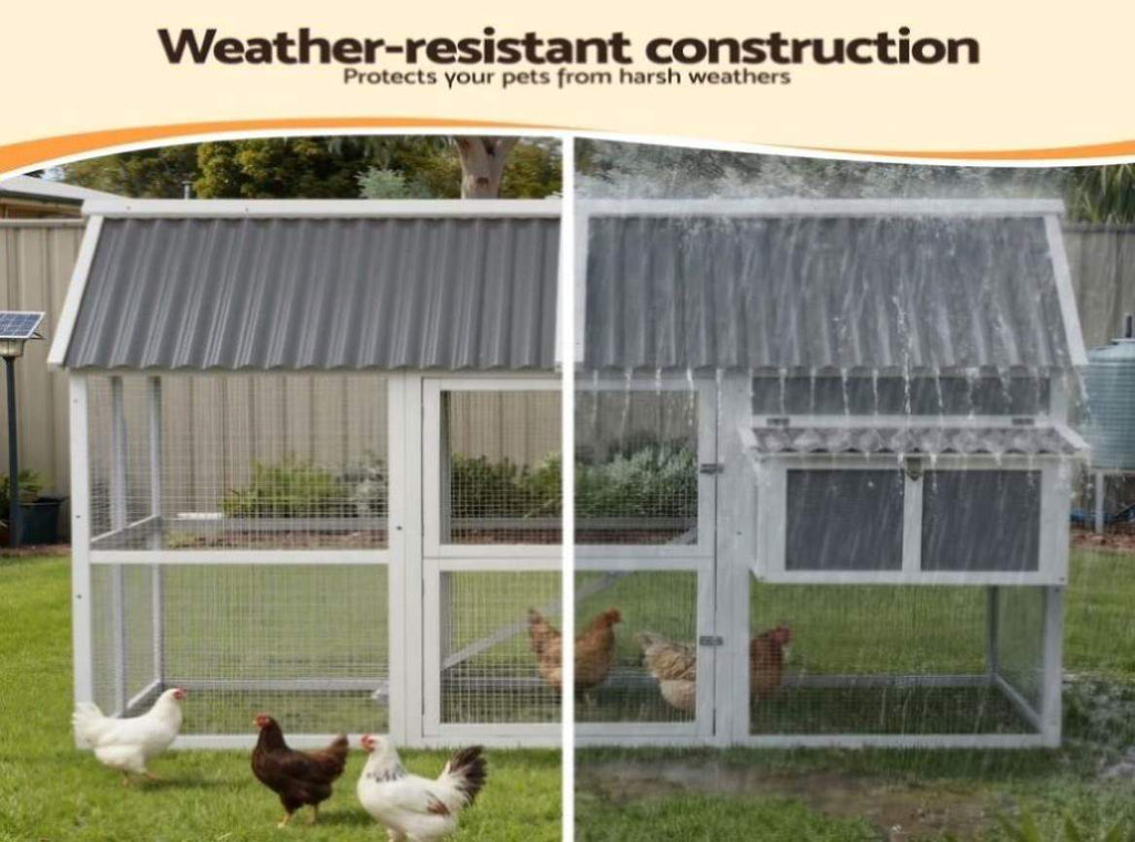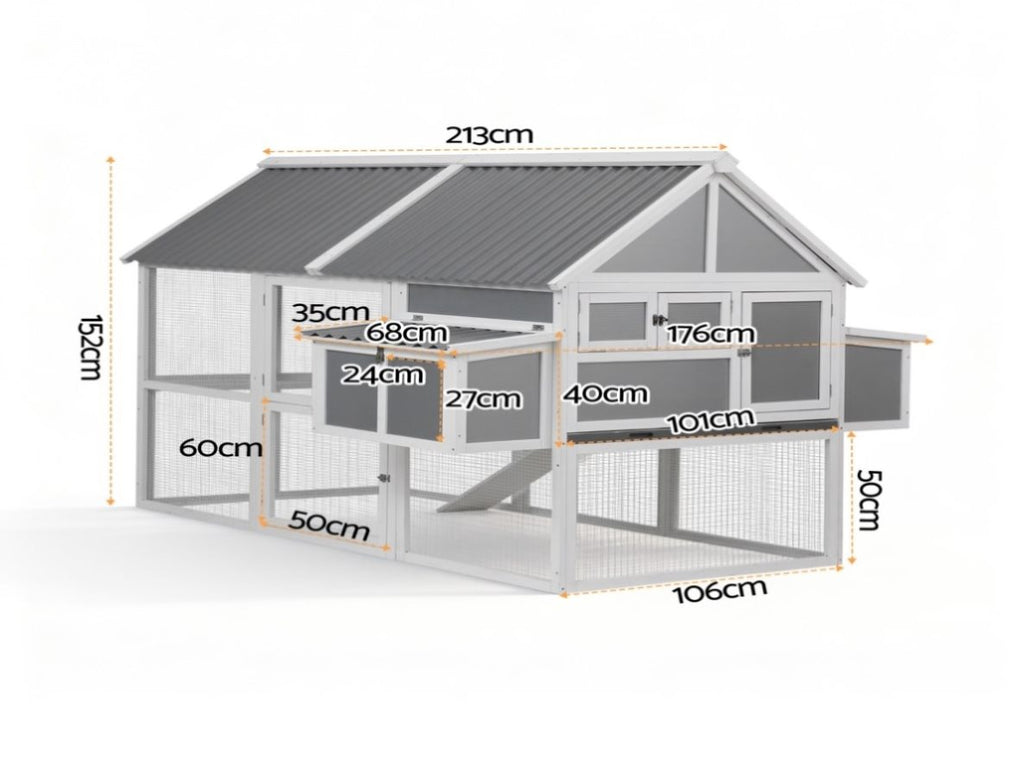 Crafted from durable fir wood and featuring a weather-resistant, sloped PVC roof, this chook house is built to handle our sunny days and rainy spells. The tough, galvanised mesh and secure latches are designed to keep your poultry safe from predators, giving you peace of mind.