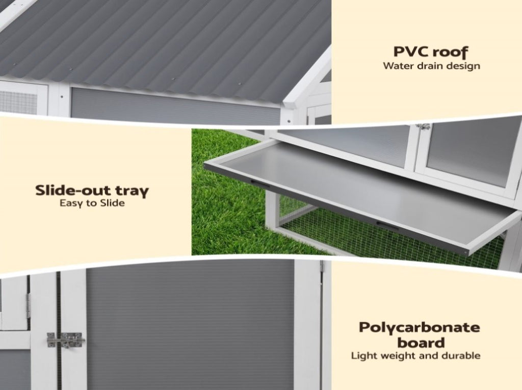 Your hens will love the spacious enclosed play area, complete with an integrated ramp for easy access. The dedicated hatching box makes collecting your daily fresh eggs a breeze. Best of all, clean-up is simple with the convenient slide-out tray, making regular maintenance quick and easy.