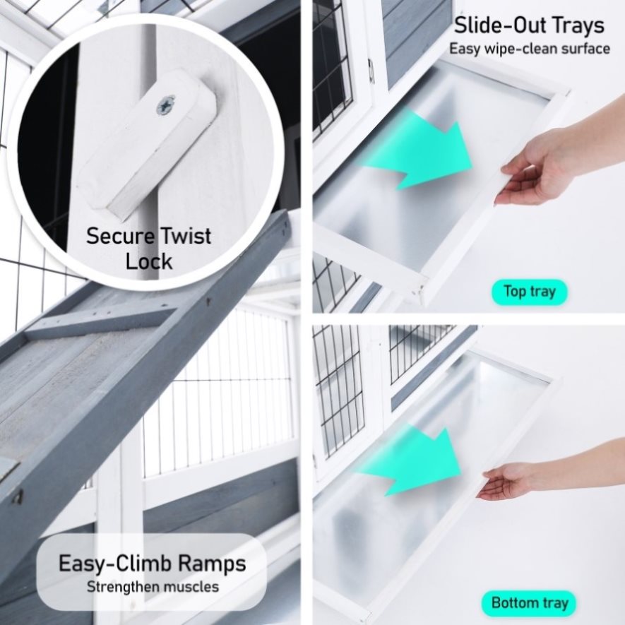 Made from non-toxic fir wood and galvanized mesh wire, our hutch provides a safe and durable space for your pets to rest and exercise. With a double-level enclosure and a ramp to strengthen your pets' muscles, this hutch is designed to meet your pets' needs.