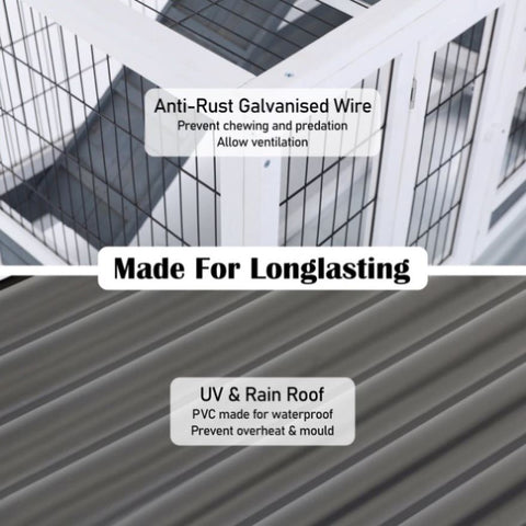 It is crucial to keep pets cool to prevent heat stress, especially if they live outdoors. Our hutch is designed to keep pets cool, and it features a well-insulated and weatherproof PVC roof that can withstand extreme weather conditions. Additionally, the hutch provides convenience and security with a pull-out tray for quick cleaning and several lockable doors for safeguarding and easy access.