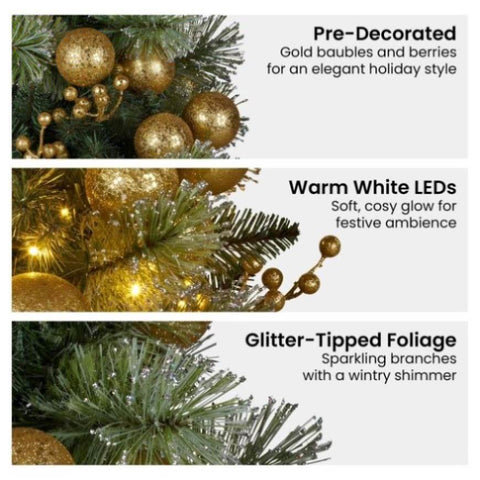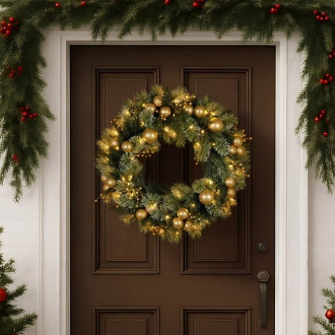 This Christabelle premium wreath arrives ready to hang, with glitter-tipped foliage, classic gold baubles, and berries that capture traditional holiday flair at a glance. The lush greens are wrapped with 50 warm white LEDs to cast a soft, inviting light across your doorway, wall, or mantel.