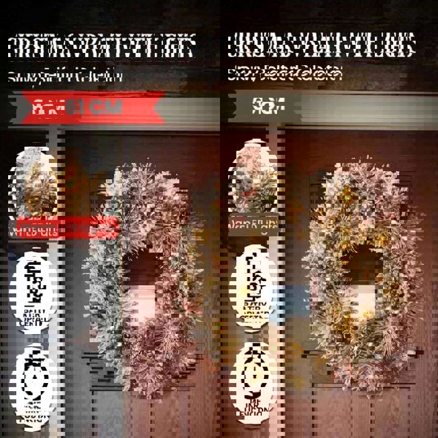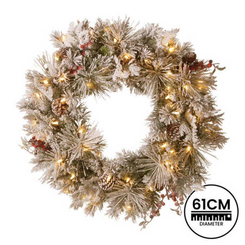 Christabelle 61cm Snowy Christmas Wreath Bedford with LED Lights Front Door Decoration Ornament 112_NATSB61W