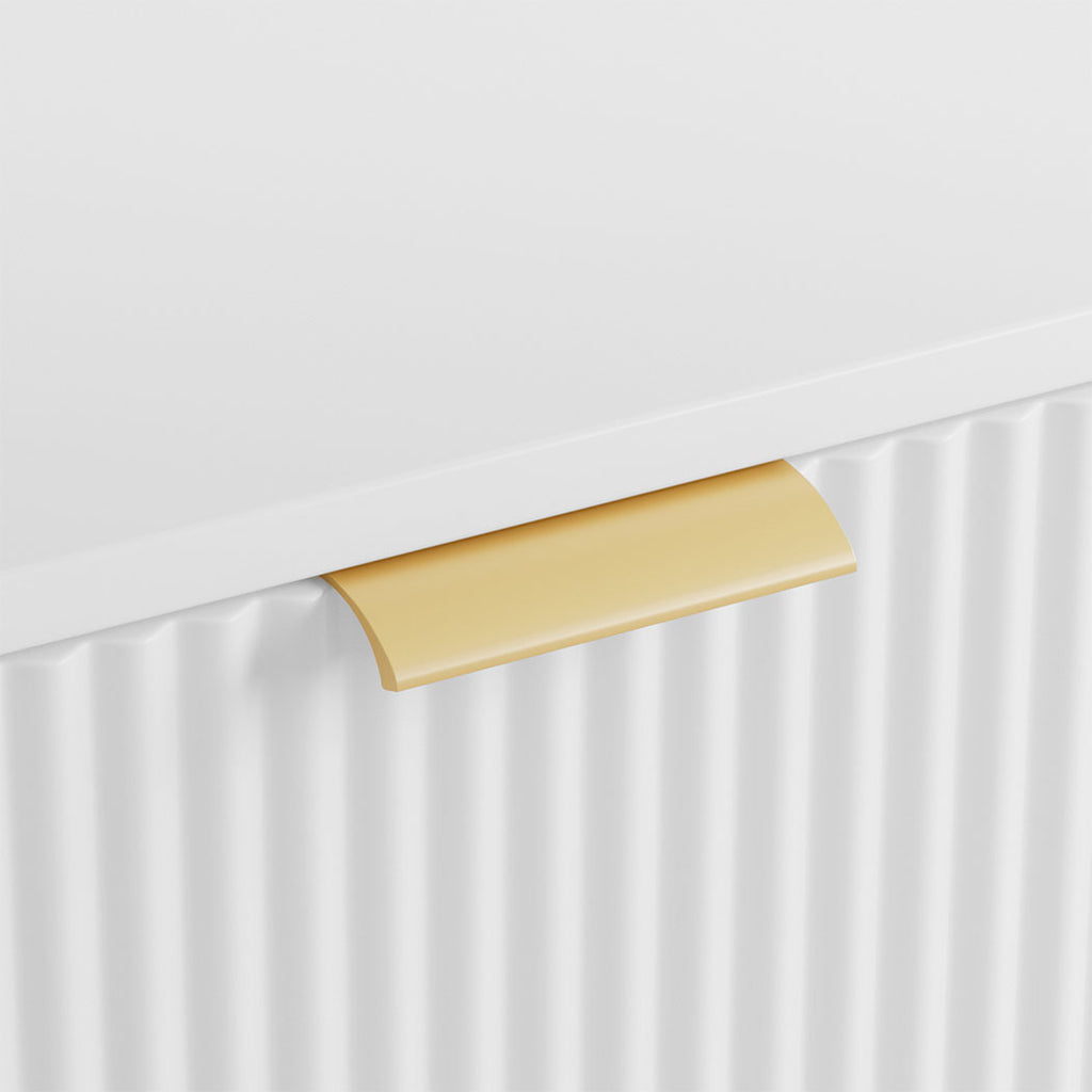 This modern white coffee table brings an elegant touch to any living space. Crafted with a smooth wooden board and accented with gold metal handles and legs, it exudes a luxurious yet versatile charm. One side features a spacious drawer with a fluted design, perfect for storing essentials, while the other half offers an open shelf for easy access to decorative items or books. The table is thoughtfully designed with rubber feet mats to protect your floors from scratches. Its clean, sleek lines make it a perfect addition to any contemporary home.