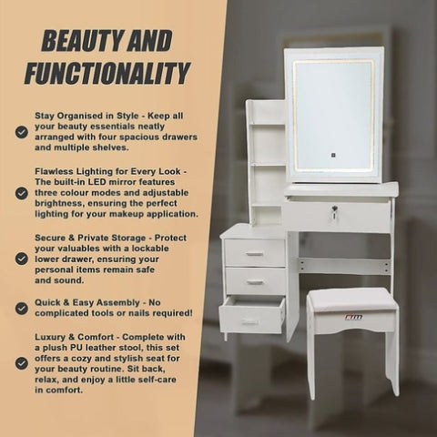 Enhance your bedroom or cozy corner with this elegant vanity set. Featuring a stylish design, built-in LED mirror, and convenient storage drawer, it seamlessly combines beauty and functionalitykeeping your essentials organised and within easy reach.