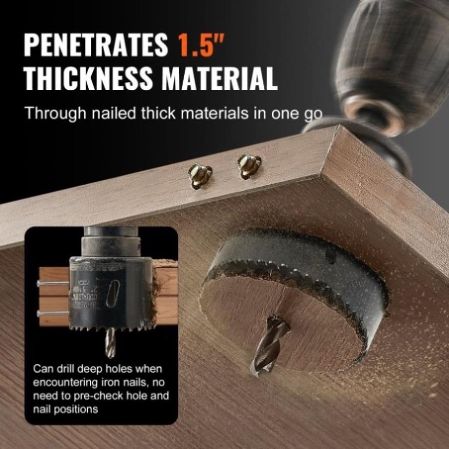 Our bi-metal hole saw kit is designed for thick materials, cutting up to 1.5"/38mm depth. There is no need to avoid pre-existing iron nails and no need to align holes for pre-assembled pieces.