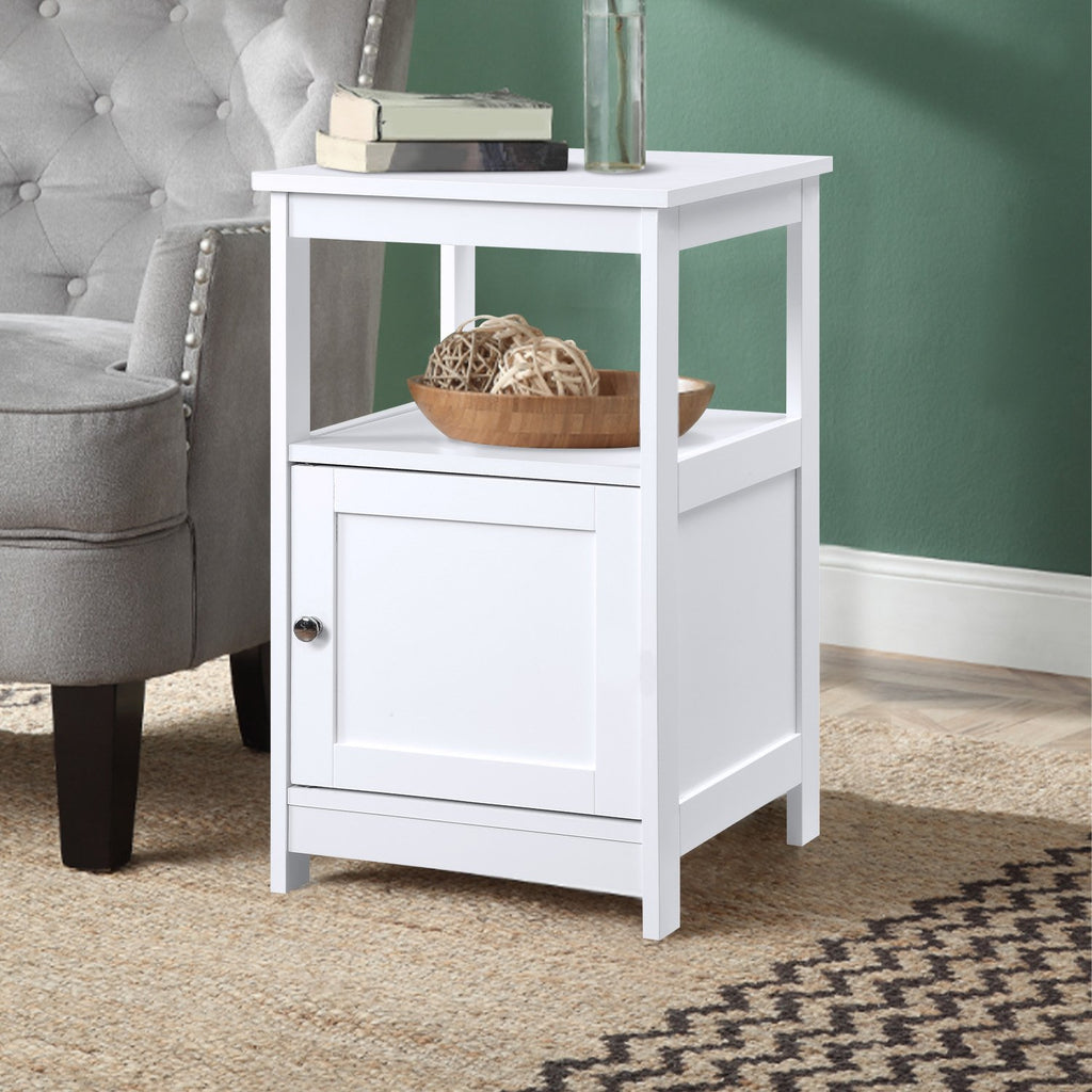 It features a discreet door cabinet that allows you to keep items hidden yet within reach. Complete with a sleek chrome handle, this end table exudes modern elegance. Crafted with attention to detail, the Corina End Table combines style, practicality, and versatility, making it the perfect addition to your living room.