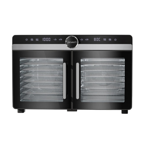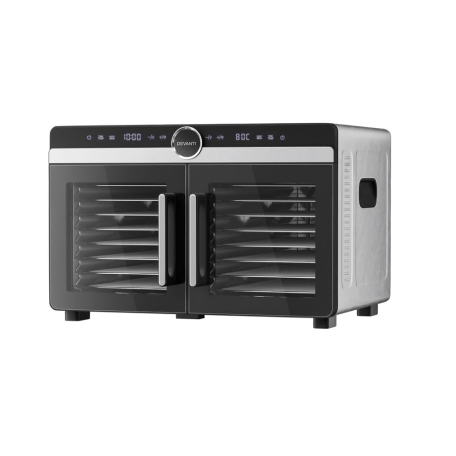 Unlock Professional-Grade Dehydration with Precision & Convenience! Devanti dual-zone large-capacity food dehydrator revolutionizes home drying with 16 food-grade stainless steel trays, offering ample space for fruits, vegetables, herbs, meats, and more. Equipped with an intuitive LED touch control panel, effortlessly adjust temperatures (35�C�80�C) and timers (0.5�48 hours) for customized dehydration. The transparent glass door and built-in lamp let you monitor progress without interrupting the process, while the stainless steel body ensures durability. Dual-zone technology allows simultaneous drying of different foods at separate temperatures, eliminating flavor transfer. Safety meets innovation with a heat-shielding vent, anti-slip feet, and an overheating protection system. Removable trays, included fruit roll sheets, and mesh trays simplify versatility and cleanup. Perfect for health enthusiasts and culinary pros!