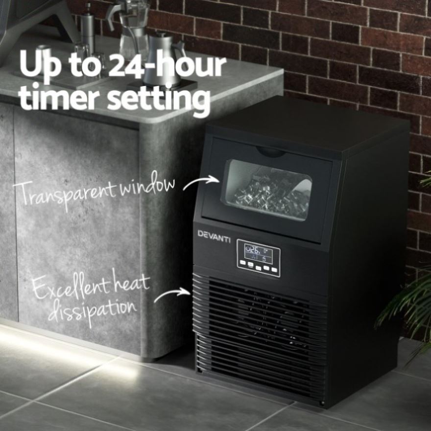 Don't let your guests or customers go without cool drinks. With the Devanti Commercial Ice Maker, you'll be able to keep the drinks flowing. The ice maker can produce three different thicknesses of its crystalline square-shaped cubes to suit your guest's needs, and the machine is capable of making 32 cubes every ice-making cycle, and up to 30kg of ice every 24 hours. You can easily monitor the ice-making process through the transparent inspection window, and automatic sensors will let you know when the water level is low or the ice tray is full. You can even set a timer for up to 24 hours of hands-free ice-making complete with an auto-shutdown. It has an auto-cleaning function that cleans the ice tray and water tank so you can create clean, fresh cubes every time. The machine is easy to install simply plug in the power cable and the included water intake and drainage hoses. The machine operates perfectly quietly and is suitable for both home and commercial operations. Keep it cool and enjoy fresh, crisp ice any time with the Devanti Commercial Ice Maker.