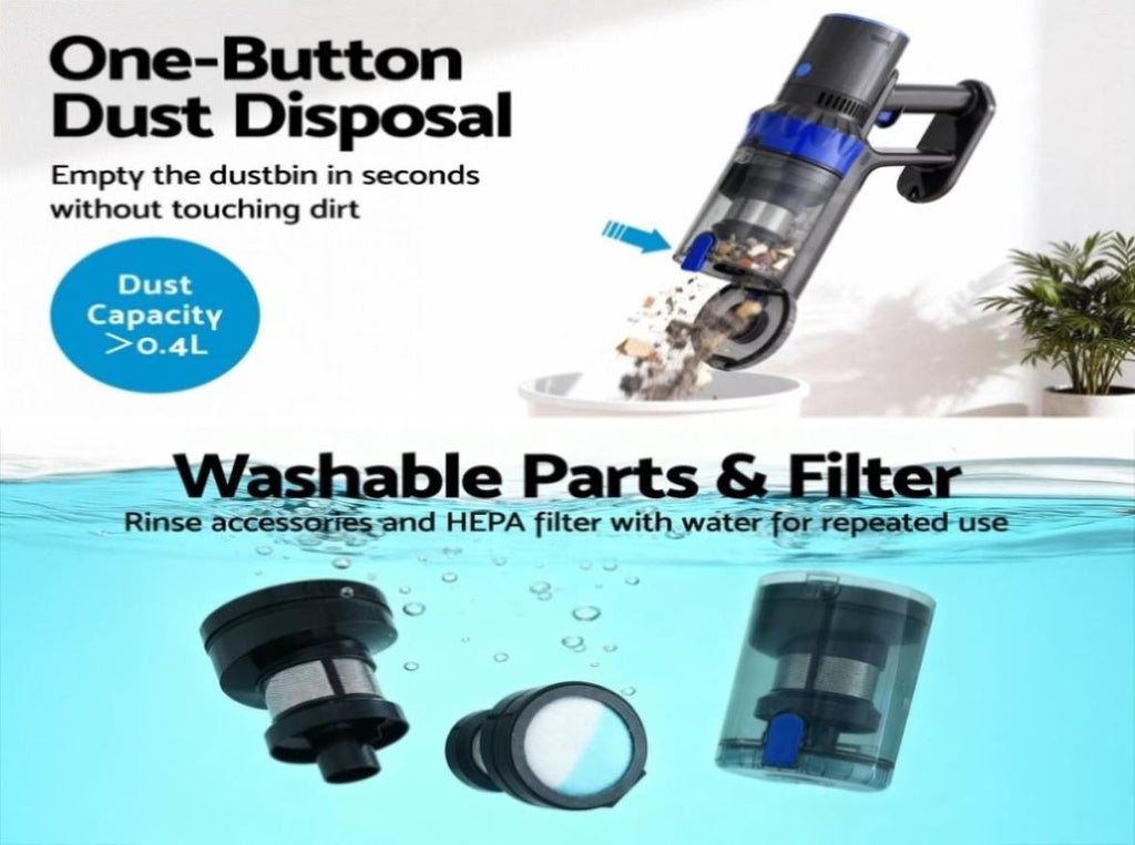 Keep your floors spotless with the Devanti handstick vacuum cleaner, designed for powerful performance and everyday convenience. Its strong suction and soft roller head are gentle on hard floors yet tough on dust, dirt, and fine debris. The upgraded brushless motor offers adjustable two-speed modes, lower noise, and improved energy efficiency, while the 2000mAh rechargeable Li-ion battery provides extended runtime for whole-home cleaning.