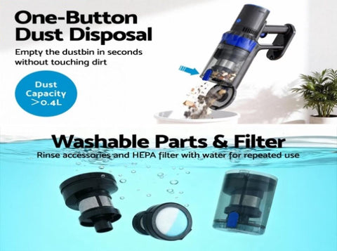 Upgraded dust cup, One-button dust disposal