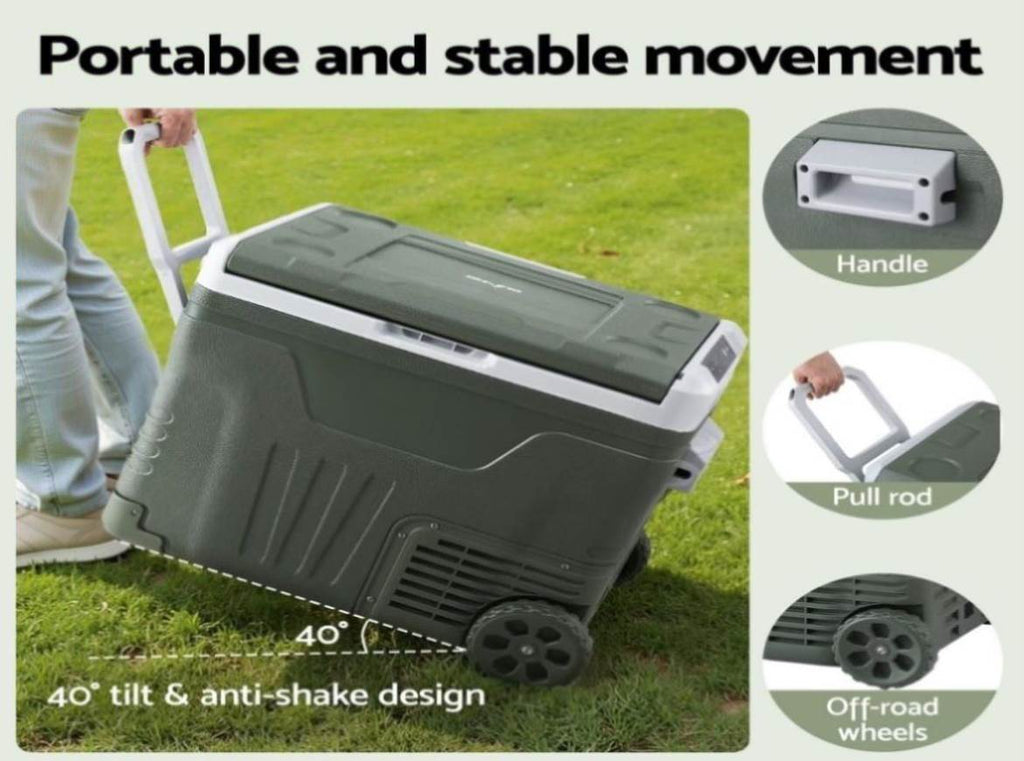 In the market for a portable fridge or freezer Our exceptional Portable Fridge/Freezer is one cool device with extraordinary performance. Perfect for use on the road or indoors, the fridge easily plugs into any 12V, 24V or 240V power point for the powerful compressor to kick in its cooling prowess. A simple LCD with even simpler operational setting allows you to start the refrigeration process easily: just turn on the power, set the temperature, and the genuine compressor will do the rest. The compressor is very energy-efficient,offering ECO and MAX cooling modes about 1.32kWh for every 24 hours of use. When running on DC power, the battery has 3-stage charging protection that cuts off charging once the voltage setting is attained to ensure longer-lasting battery life. The fridge has plenty of space for all your food and drinks with removable divider that also serves as a cutting board, and you can adjust the temperature down to -20 . The heavy-duty exterior is designed to handle all the knocks and bumps of a road trip and comes with 4 cup holders on the top lid, plus easy carry handles,pull rod and off-road wheels for portability. With so much going for it, our Portable Fridge/Freezer is surely your choice of a reliable cooler for all your outdoor (or indoor) escapades.