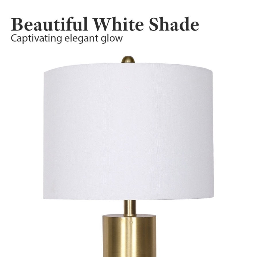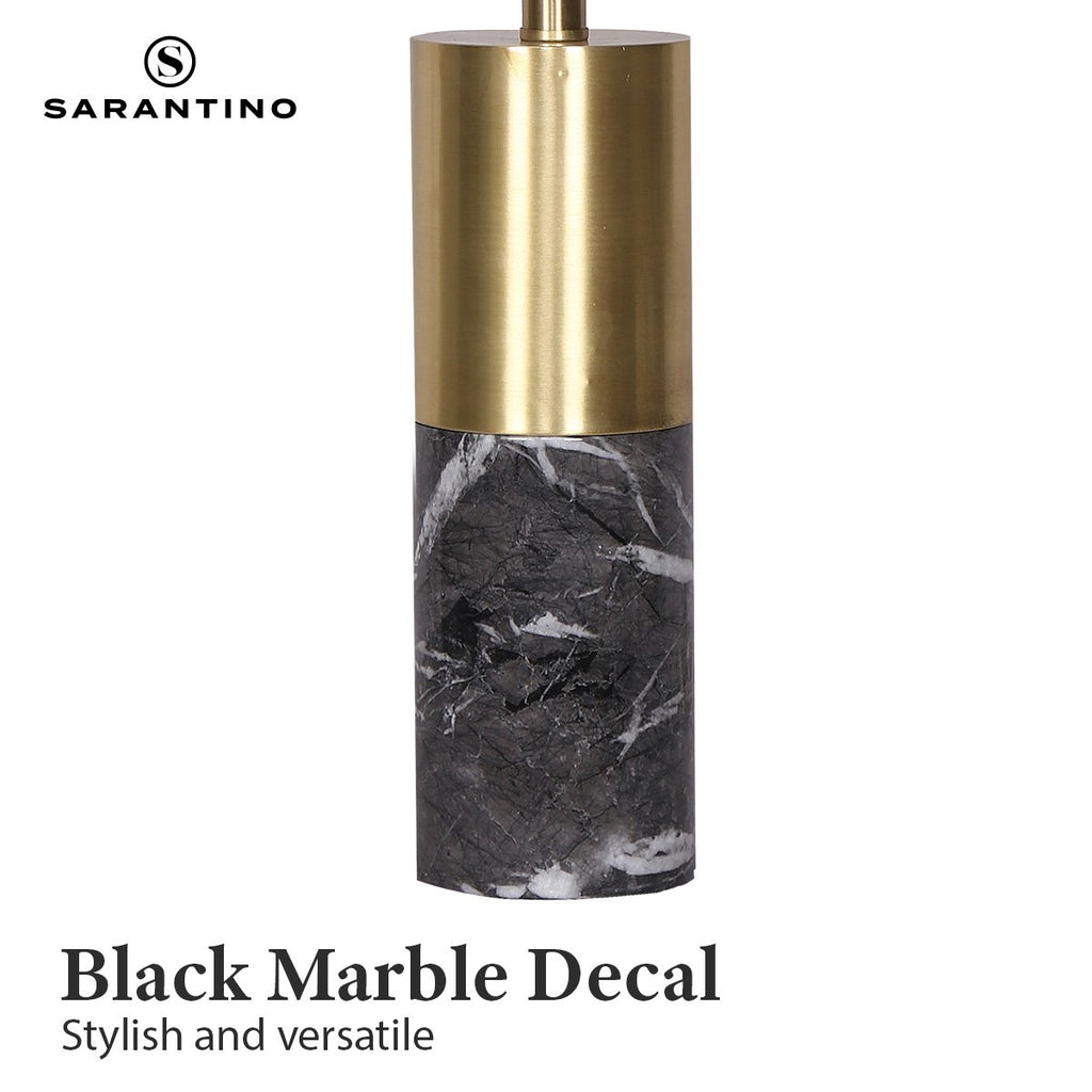 Elevate your modern home with this metal and faux marble table lamp from Sarantino, a seamless blend of luxury and contemporary appeal in design. Meticulously crafted, the lamp boasts a stunning golden brass metalwork that exudes elegance and the refined faux black marble decal introduces a dash of sophistication to any room. Crowned with a white drum shade, this lamp harmonises chic aesthetic and practicality, casting a gentle and welcoming glow over your space.