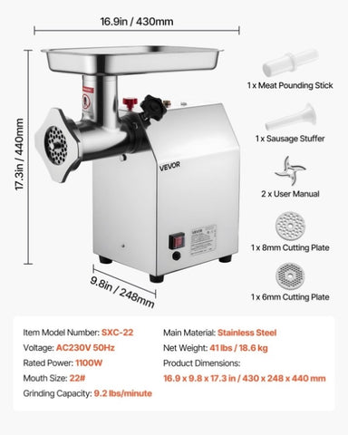 The commercial countertop meat grinder, mouth size 22#, features a highly efficient 1100W pure copper motor capable of grinding 9.2 lbs of meat per minute. It can operate continuously for 30 minutes, making it ideal for large-scale commercial meat grinding needs. Avoid letting the grinder idle for too long as it may damage the motor. Remember to promptly turn off the power when not in use