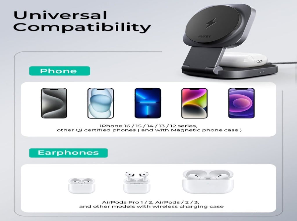 Charge smarter and faster with the AUKEY LC-MC211, your ultimate on-the-go wireless charging solution. Designed with the latest Qi2 technology, this sleek and compact 2-in-1 magnetic charger powers up your iPhone and AirPods simultaneously with maximum efficiency and style.