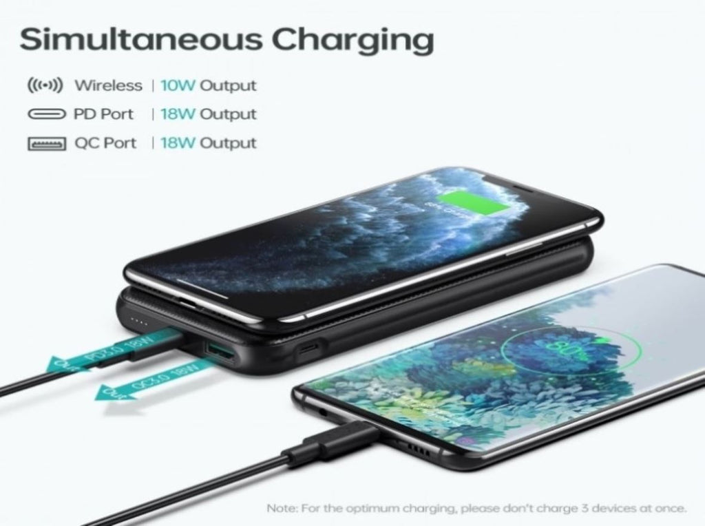 Bulit-in Micro-USB,USB-C ,USB A on this portable charger. Note: This power bank supports 18W maximum output when charging 1 device via the USB A or USB C port and 10W wireless charge max output for Qi-enabled devices.