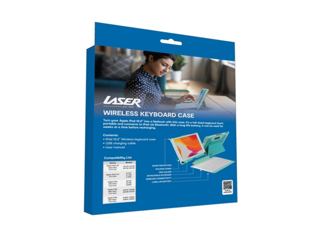 The case folds flat when not in use, making it easy to slip into a backpack or handbag. Whether you're working from a café, attending classes, or travelling, the Laser Wireless Keyboard Case ensures your iPad stays protected while boosting your productivity wherever you go.