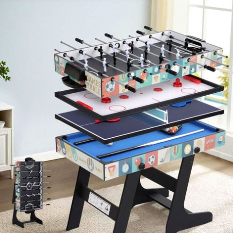 Bring endless fun home with this 4-in-1 multi game table, a fantastic addition for any Australian household. This foldable game table combines a foosball table, table tennis table, pool table, and table hockey into one compact unit, offering a truly multi-activity combination. Crafted from durable MDF, it promises a long-lasting, sleek look. It's designed for easy operation and quick game conversion, making it ideal for both kids' entertainment and memorable family parties. This versatile game table provides hours of fun for all ages.