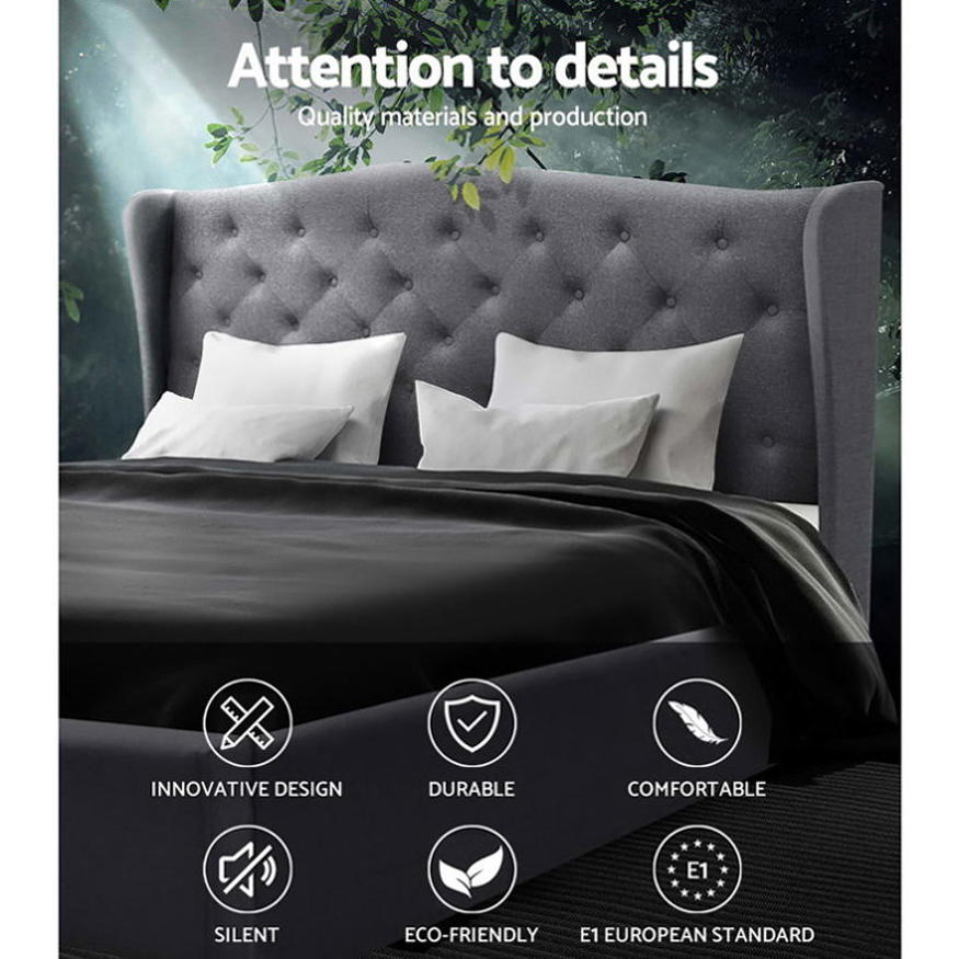 The iconic European wing headboard reflects prestigious grandeur while the tufted design complements its overall image. Padded with high density foam and upholstered in breathable non-woven linen fabric, the Pier Bed Frame is comfortable to lean on and soft to the touch.
