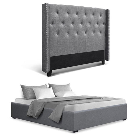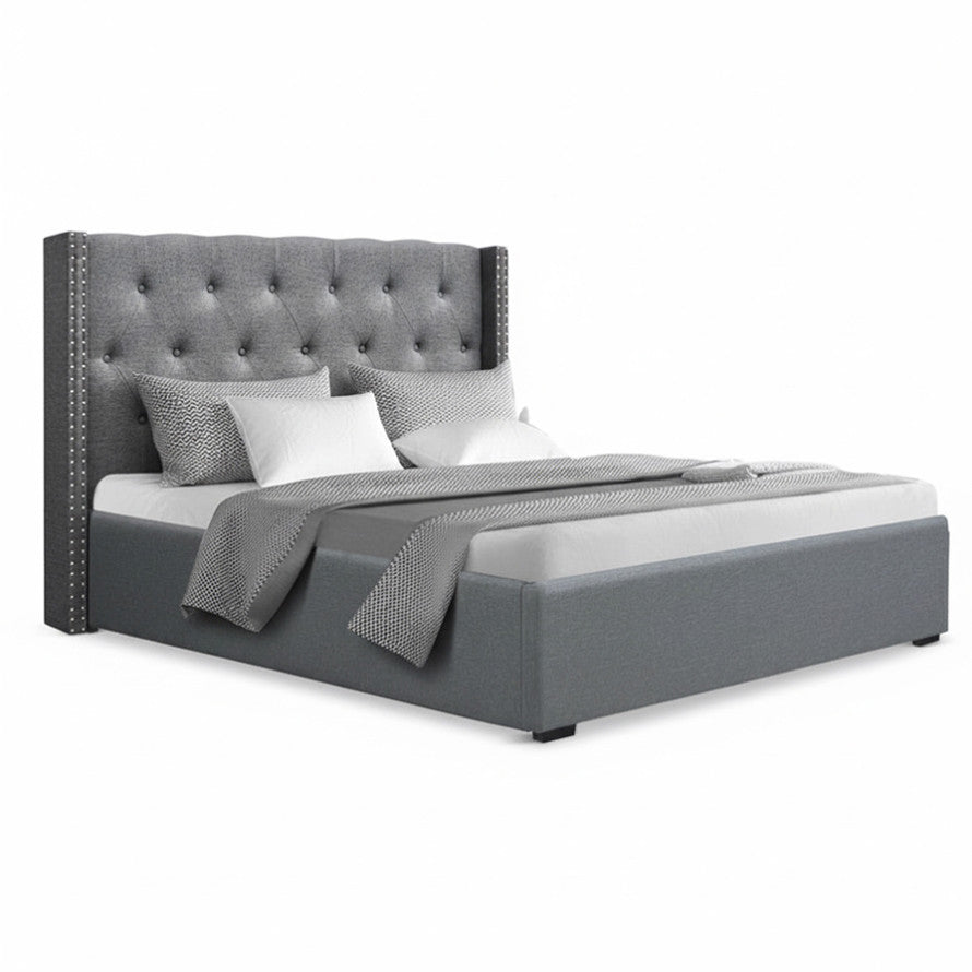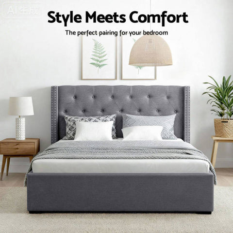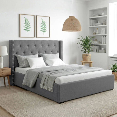 This Artiss Queen Bed Frame combines practical storage with elegant design. The gas lift base provides hidden storage space beneath, while the button-tufted winged headboard adds sophisticated style. Crafted with reinforced wood framing and durable faux linen upholstery over high-density foam. Features sturdy rubber wood legs, metal connectors, and supports up to 300kg. Accommodates standard Queen mattresses (203x153cm). Grey finish complements modern bedrooms. Easy assembly required.