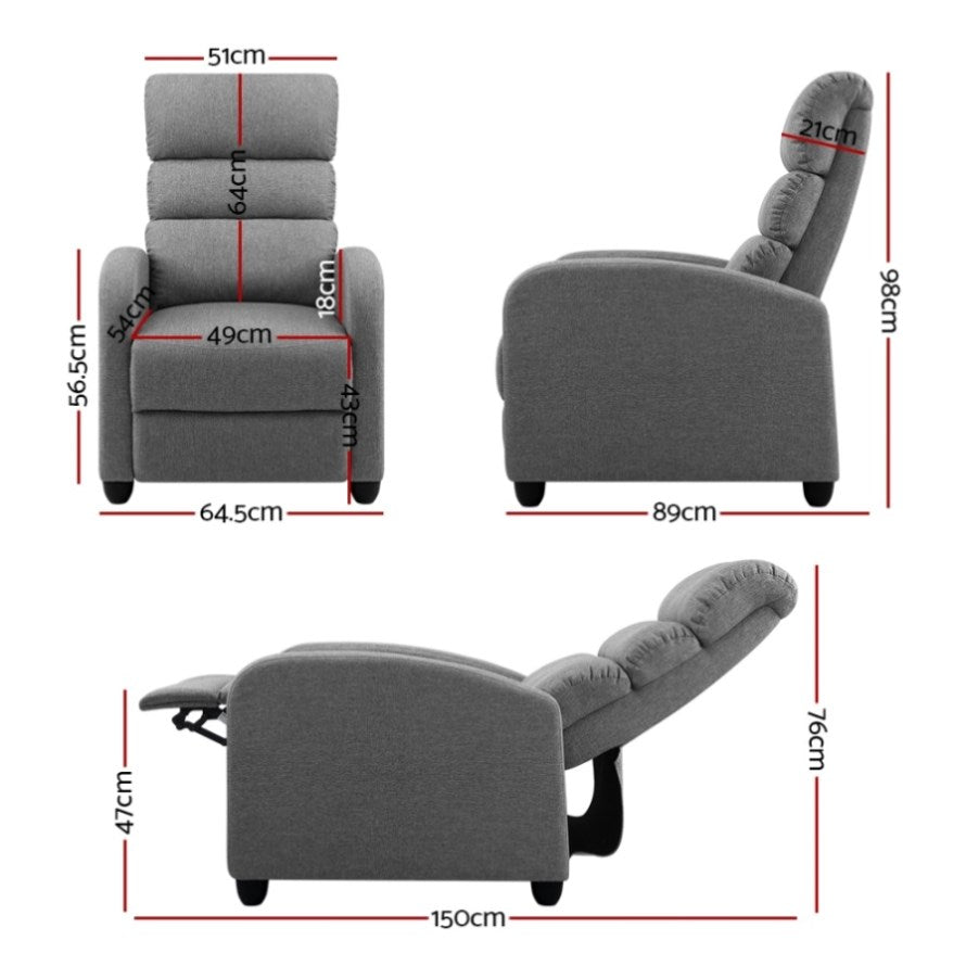 Enjoy the gold class movie experience in your own home with our Artiss Recliner Chair. Richly padded in high-resilience foam and upholstered in smooth and duarable faux linen fabric, the chair certainly looks like it belongs in gold class. In the upright position, the recliner is a comfortable armchair where you can sit for long chats with guests. Or you can easily adjust the backrest and footrest to recline to your preferred angle. The backrest has three padded zones for full head and back support so that no matter the tilt, you have total body comfort. The chair is suitable in any room with its classic design. Keep it in your study to be perfectly rested during your work breaks. In the living room for watching television or listening to music. Or keep several in the media room for the complete cinema experience. Wherever you decide to put it, you can always sit back and relax on our recliner chair.