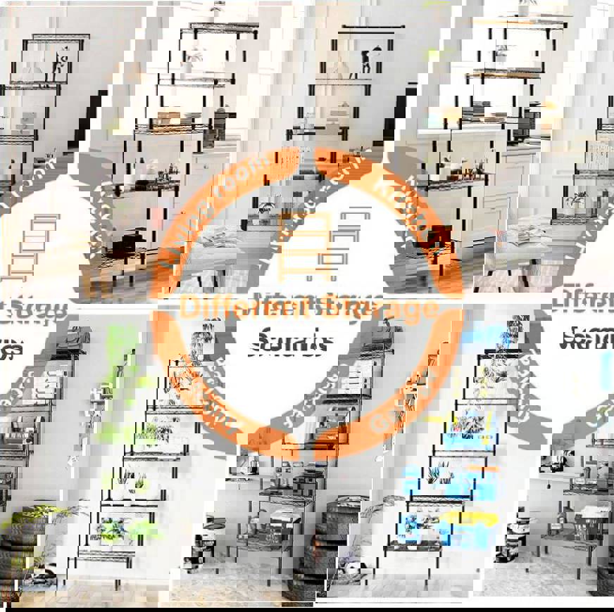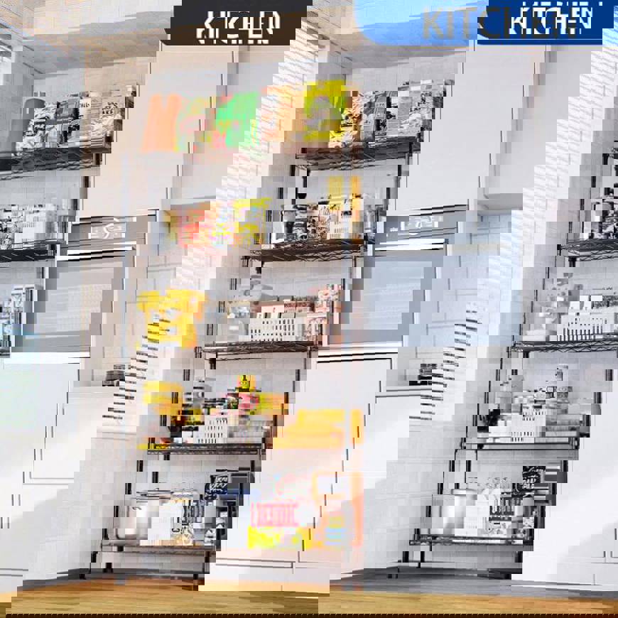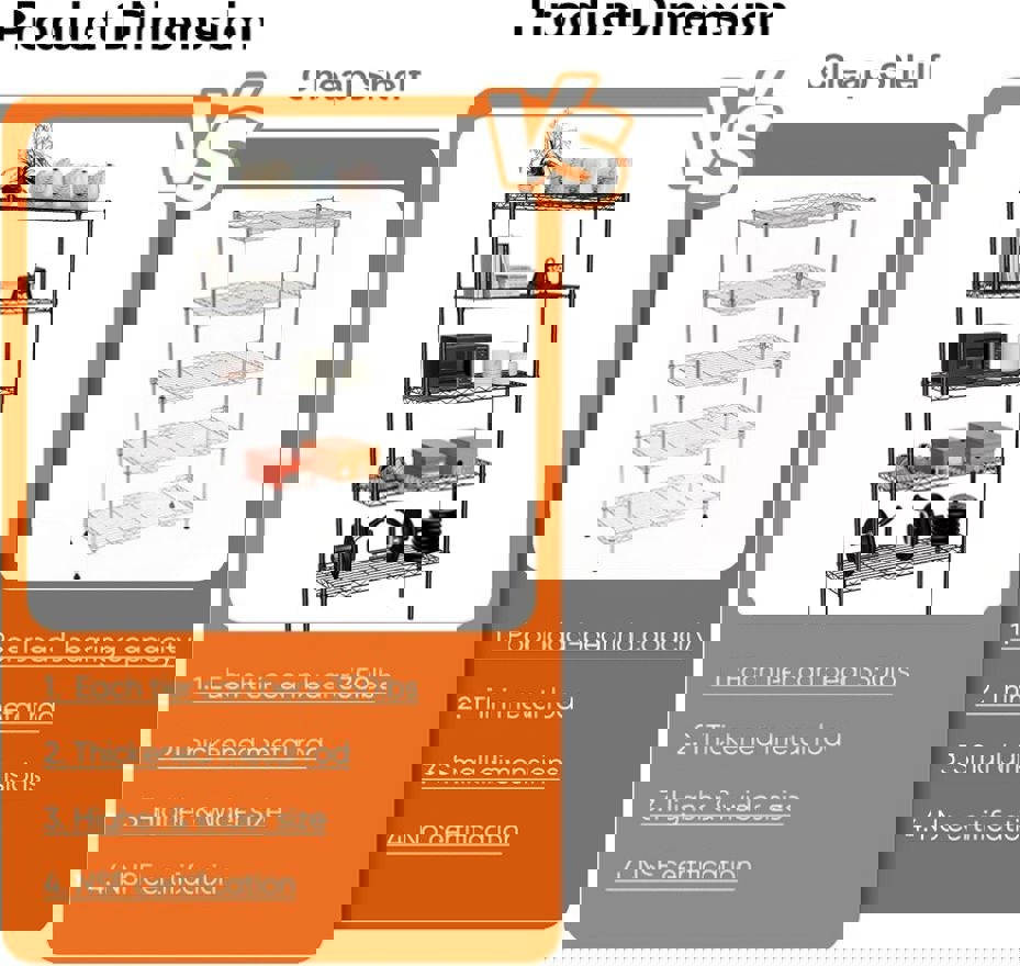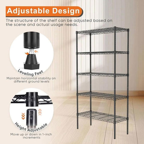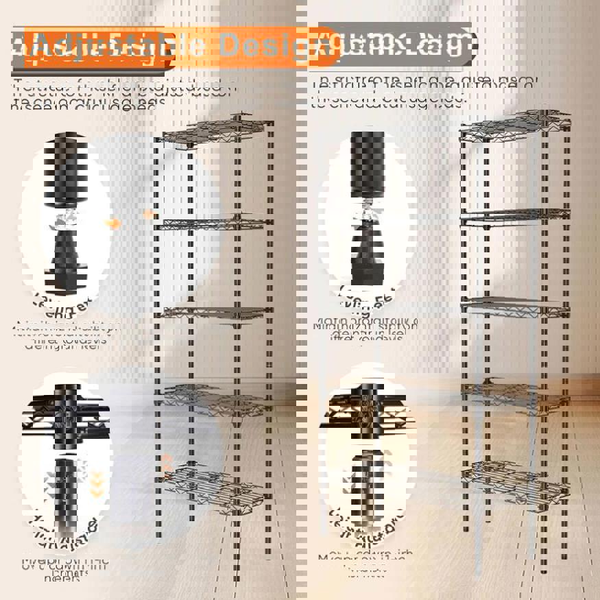 - ADJUSTABLE 5-TIER DESIGN: Customize each tier�s height to fit tall bottles, appliances, or baskets. Perfect for flexible storage of pantry items, cleaning supplies, toiletries, or household tools.