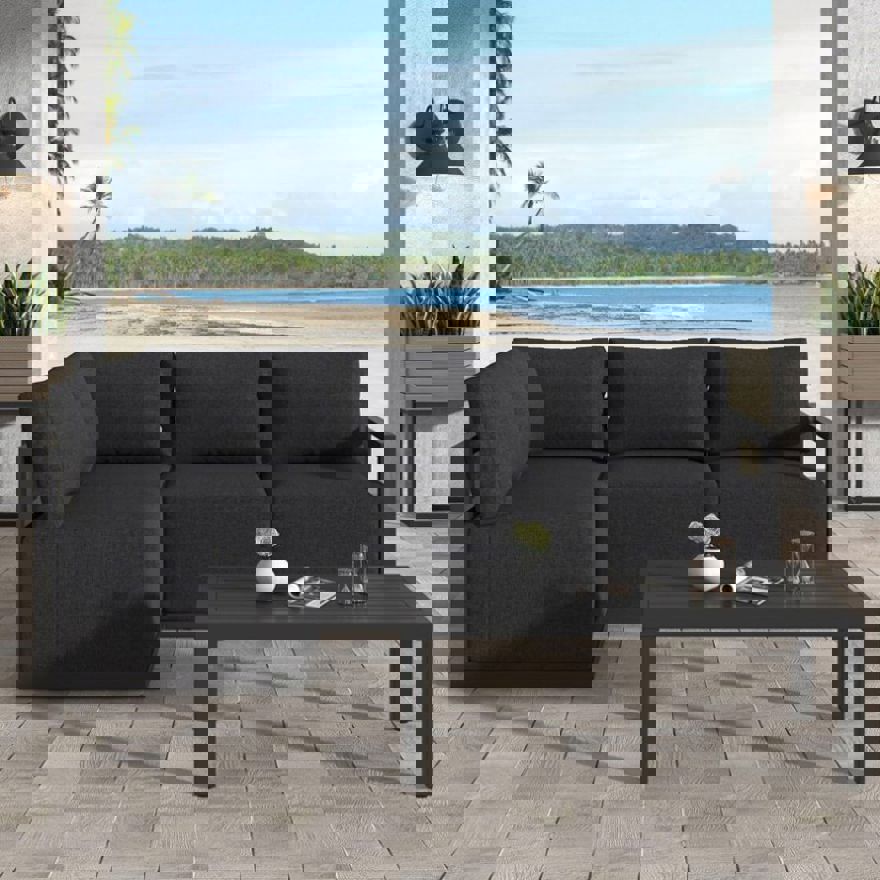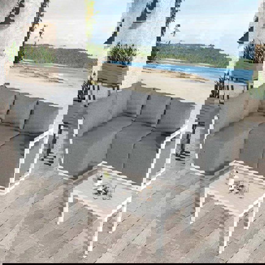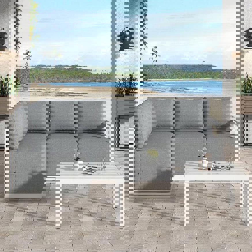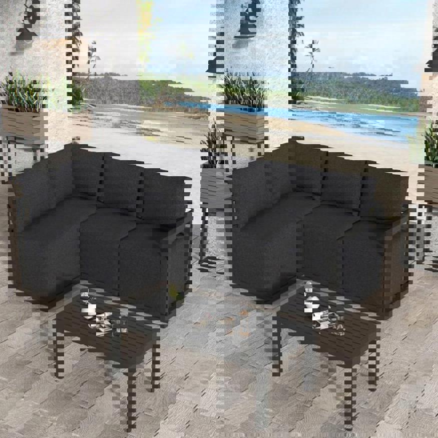 It includes two armless sofas, a corner sofa, a left armrest sofa, and a coffee table. The pure aluminum frame is paired with rust proof powder,It showcases a sense of high-end fashion and also easy to maintain. The interior of the sofa cushion is a 40cm thick high-density foam, soft and comfortable, and suitable for all seasons.