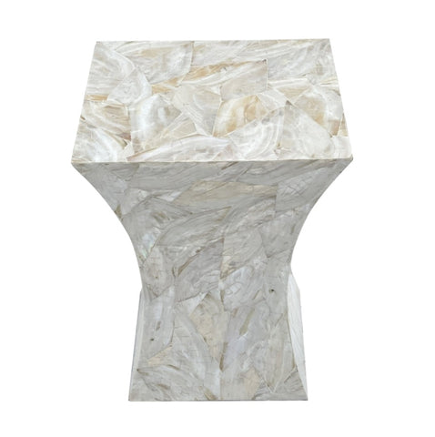 GLEESON MOTHER OF PEARL HAND MADE SIDE TABLE Create a statement piece in your living space with this beautiful, handcrafted mother of pearl side table from Gleeson! It will add a touch of elegance and sophistication to any room, making it a must-have for any home. The intricate details and stunning craftsmanship will surely impress and elevate your decor.