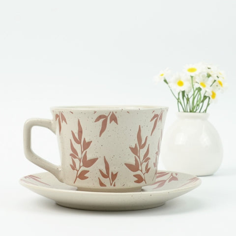 This exquisite set includes a cup and matching saucer, both adorned with a fresh floral pattern. The beauty of stoneware with a matte touch, combined with sesame glaze embellishments, creates a unique layering effect that adds sophistication to your table.