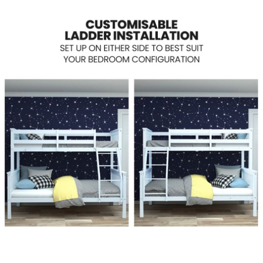 The Kingston Slumber Triple Bed Frame is crafted from solid high-quality sustainably sourced timber and is compatible with standard Australian single and double sized mattresses. Safety is paramount with SGS-certified quality, rigorously tested for superior durability. The bed features durable plywood slats and a solid, secure ladder. It even features an exclusive toy shelf which is sure to be a nice home for their favourites.