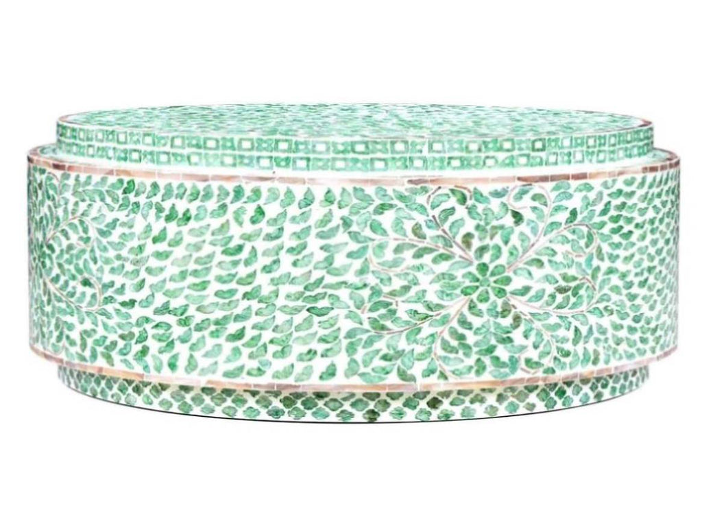 Adorned with discs of real sea shells that shimmer when they catch the light, our Layla coffee table will instantly brighten and transform a space. Invest in this stunning turquoise shell coffee table and youll admire it for many years to come. Our Layla coffee table features a pleasing, round construction with an upper circular ledge, offering a real point of difference.