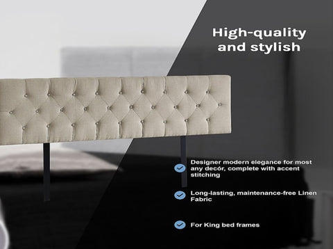 This headboard for standard King-sized bed frames is created with quality materials, including easy-to-maintain Linen Fabric that will maintain its sophisticated look for many years to come. This particular model comes with elegant stitching accents that provide just the right level of understated pop. A neutral beige will blend seamlessly with a wide variety of bed frames and other bedroom furniture.