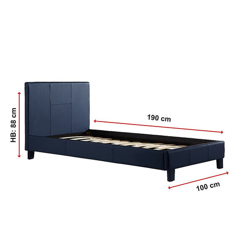 This bed from the expert craftspeople at Palermo measures 100 cm wide by 190 cm long, with a headboard that measures 88 cm tall (10cm leg 78cm headboard) from top to bottom. It fits a single mattress measuring 92 x 187 cm. The frame and headboard feature a durable PU Leather covering that's easy to clean and that will look great for many years to come. The headboard is padded for comfort while sitting up and reading or watching TV. An attractive stitched-together look and clean, simple lines make this bed frame a perfect complement to the modern bedroom. And the Blue colour adds visual appeal without being ostentatious.