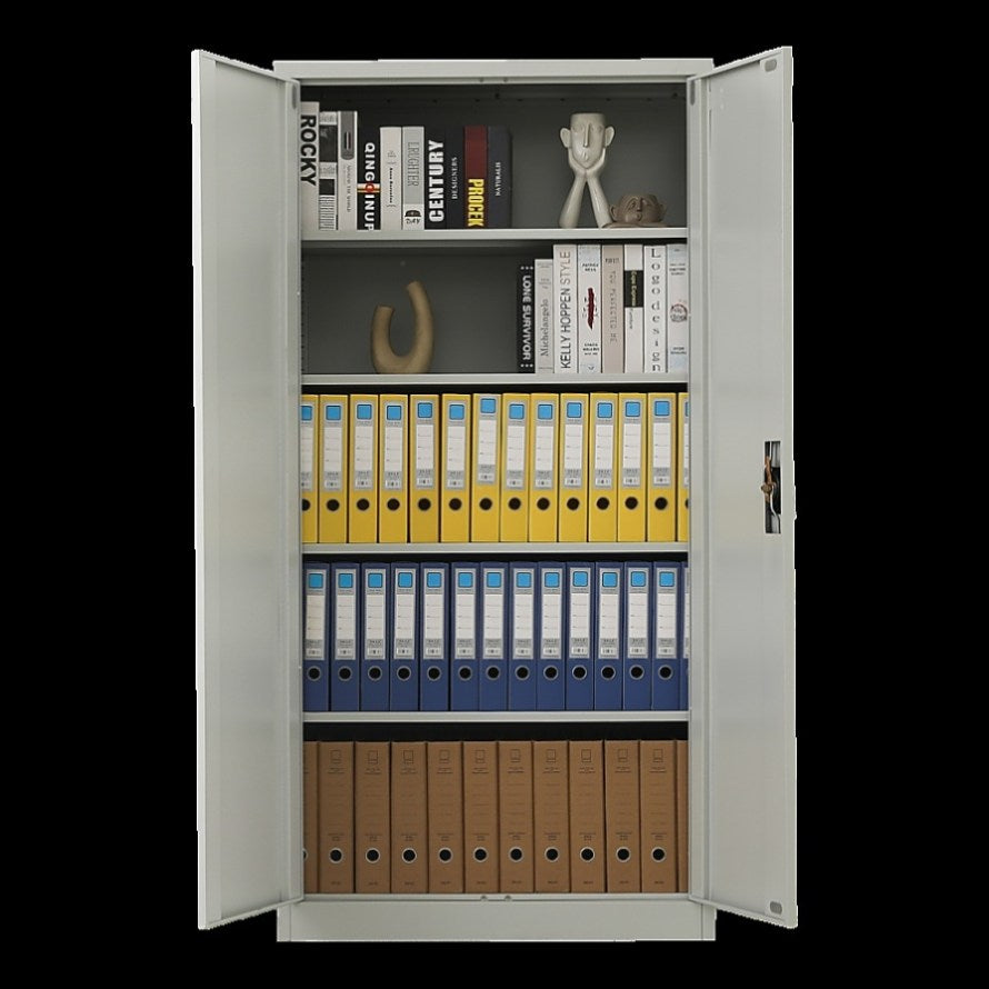 It has four internal metal shelves that define 5 storage spaces, a bottom with lateral and central reinforcement, metal hinges, and galvanised pins in inconspicuous places, and a safety lock with 2 anti-keys. The 4 inner shelves they are placed on clips so they can be easily replaced. It features 2 opening doors that provide full visibility and access to the interior of the cabinet.