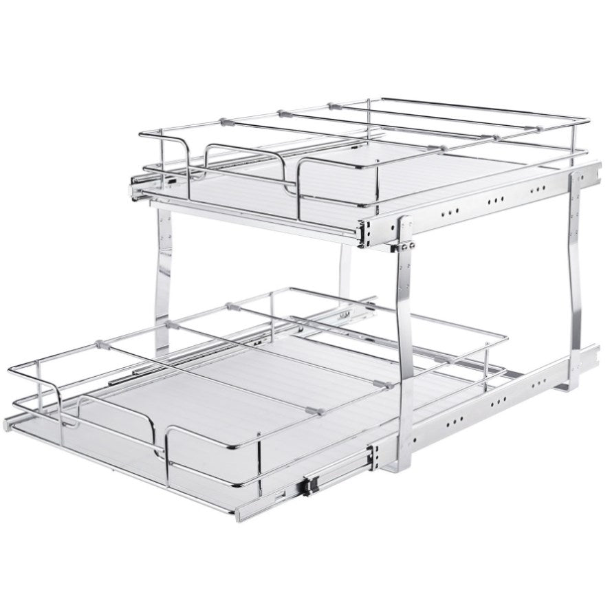 Using an industrial-grade ball sliding system, even under the weight of heavy portable equipment (such as kitchen mixers, pots and pans, and other kitchen utensils), this 2-tier wire basket slide shelf can slide smoothly without unpleasant noise.