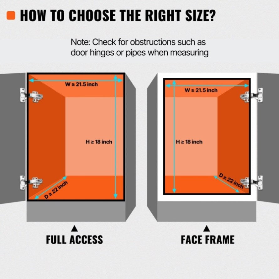 Product Size: 20"Wx21"Dx15"H; Cabinet Installation Size: 21.5"Wx22"Dx18"H. Note: Check for obstructions such as door hinges or pipes when measuring. Our 2-tier pull out cabinet shelf can create larger storage space in a small cabinet; you can use it in any cabinet. You can place pots and pans, seasoning jars, food jars, cleaning supplies, spice racks, and other items, significantly saving your storage space.