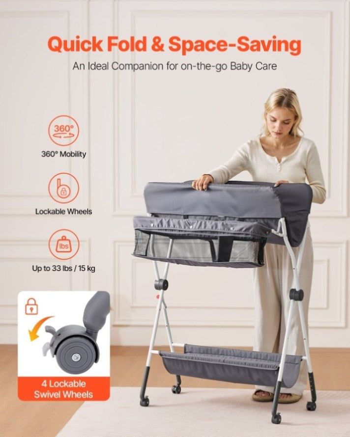 Featuring a quick-fold design and 4 lockable, silent swivel wheels, this baby changing table is easy to store and transport. The raised edges provide full 360° security protection, ensuring your baby is secure while you work.