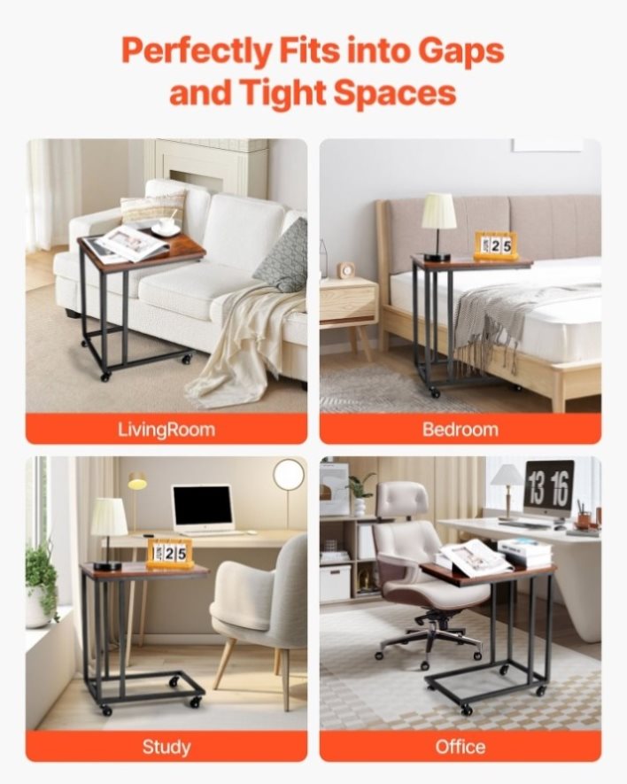Our c table end table comes with four 360° swivel casters, including two that rotate fully for effortless movement. Two brake casters provide secure support, ensuring the table stays in place while in use. Move it easily to any corner of your room without hassle