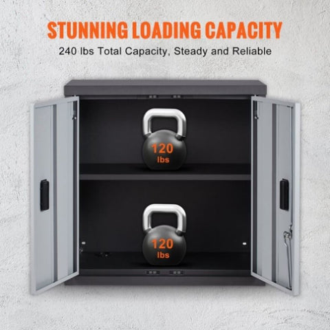 Each of the shelf supports up to 120 LBS, with a total loading capacity of 240 LBS of the wall cabinet. It's an ideal storage solution for heavy duty tools in garage, office and home.