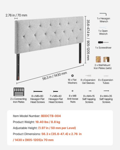 This headboard provides an adjustable height range from 35.6 in -47.4 in, fitting various bed frames with ease. No worries about compatibility, and installation is a breeze, allowing you to customize your bedroom setup effortlessly.