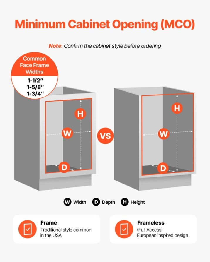 With the included mounting holes and screws, installing the trash can into your cabinet is quick and easy. Our pullout waste container comes with a door kit for mounting to the cabinet door, allowing you to conveniently pull out the trash bin. Recommanded cabinet size: Depth(front and back): ≥430 mm / ≥17 inch; Width(right and left): ≥292 mm / ≥11.5 inch; Vertical Height(up and down): ≥500 mm / ≥20 inch.
