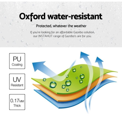 Featuring high density, long lasting PU-coating oxford fabric with effective UV and water repellent treatments, this INSTAHUT 3X4.5 Pop Up Gazebo provides a lovely ground and canopy coverage of 450 x 300cm. It is perfect for all your upcoming outdoor activities, as a sunshade station as well as a shelter for unexpected rains.
