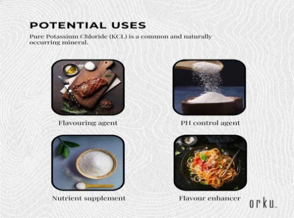 Pure Potassium Chloride (KCL) E508 is a food grade powder that comes in a resealablebucket tub.It is a common and naturally occurring mineral. It is generally used to provide potassium enrichment in foods and as a salt replacer to reduce the sodium content in food.
