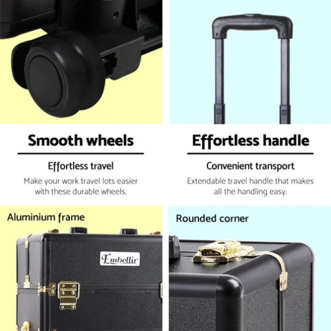 Embellir Makeup Case Beauty Trolley Cosmetic Organiser Box Travel Wheels Gold CASE-MU-4T-081-GDBK