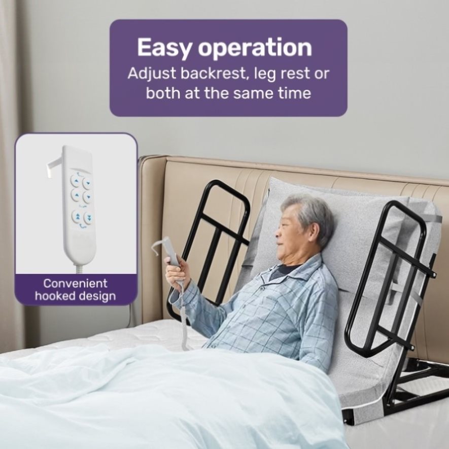The bed is outfitted with plush, comfortable cushioning covered in soft, machine-washable fabric, offering both comfort and convenience. You also have the option to attach side barriers to maintain safety without compromising usability. The Equipmed Electric Adjustable Bed seamlessly enhances daily life with functionality and ease.